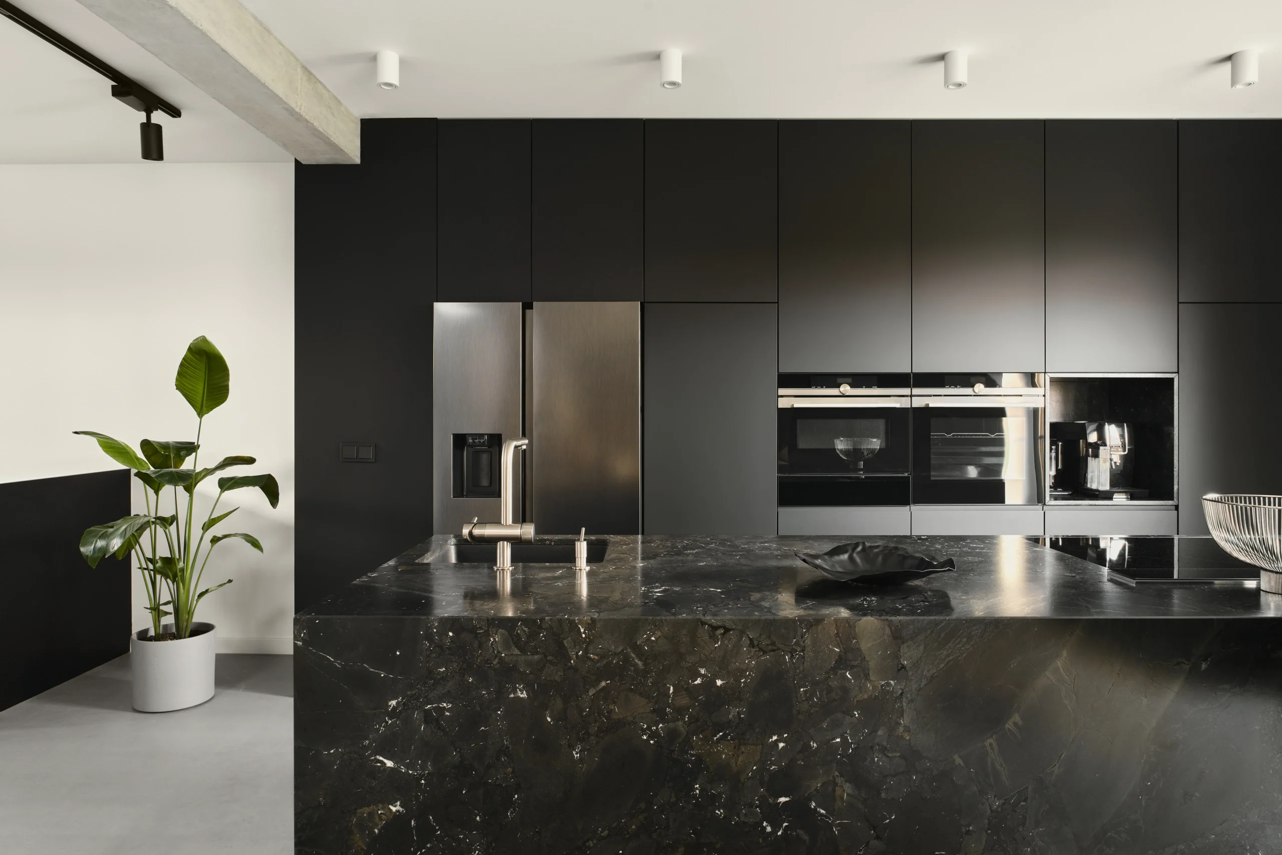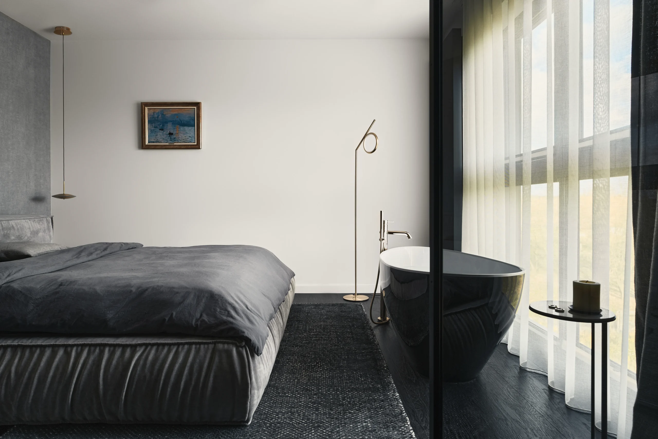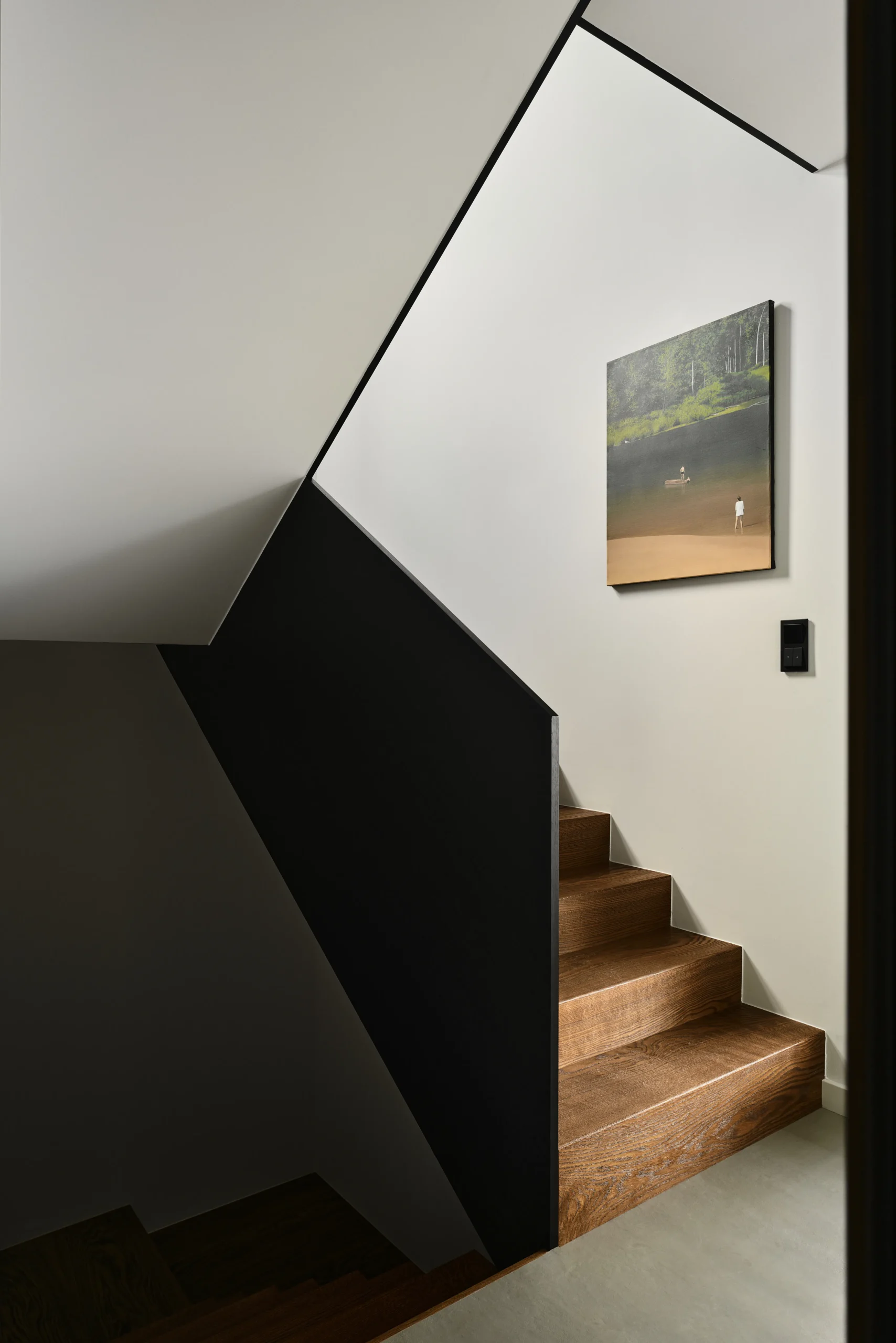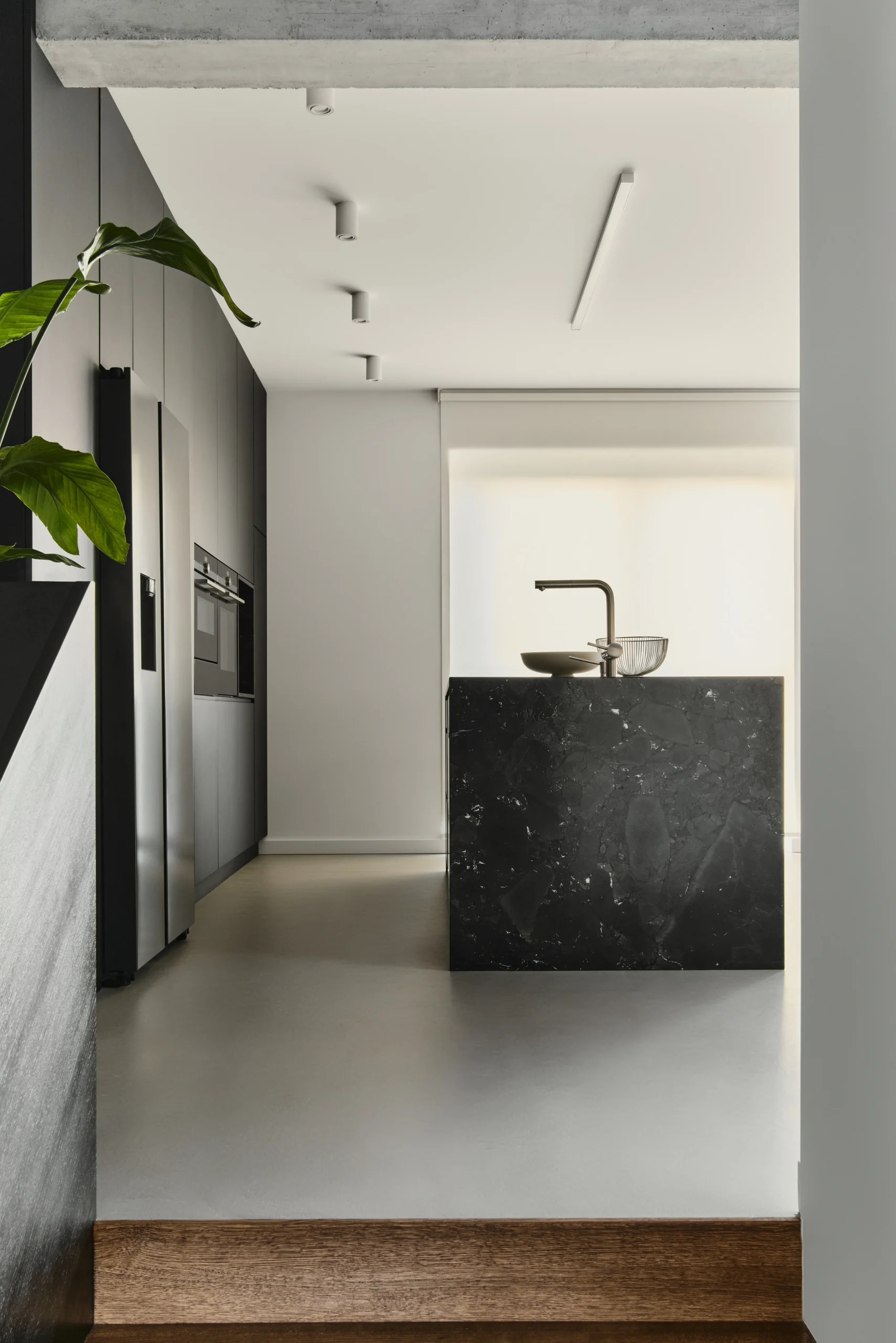 Projekt opiera się na stonowanej palecie kolorów, w której dominują odcienie bieli, szarości i czerni, co wprowadza spokój i równowagę do przestrzeni. Zastosowane materiały, takie jak drewno, kamień czy metal, tworzą subtelną elegancję, jednocześnie zachowując przyjazną atmosferę. Wnętrze zostało zaprojektowane z dbałością o detale, co nadaje mu ponadczasowy charakter.