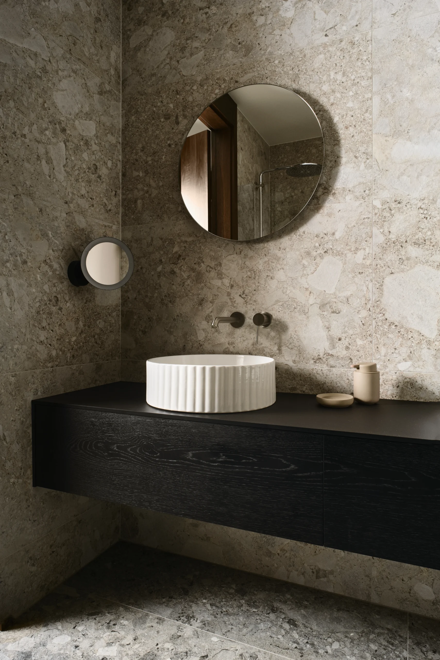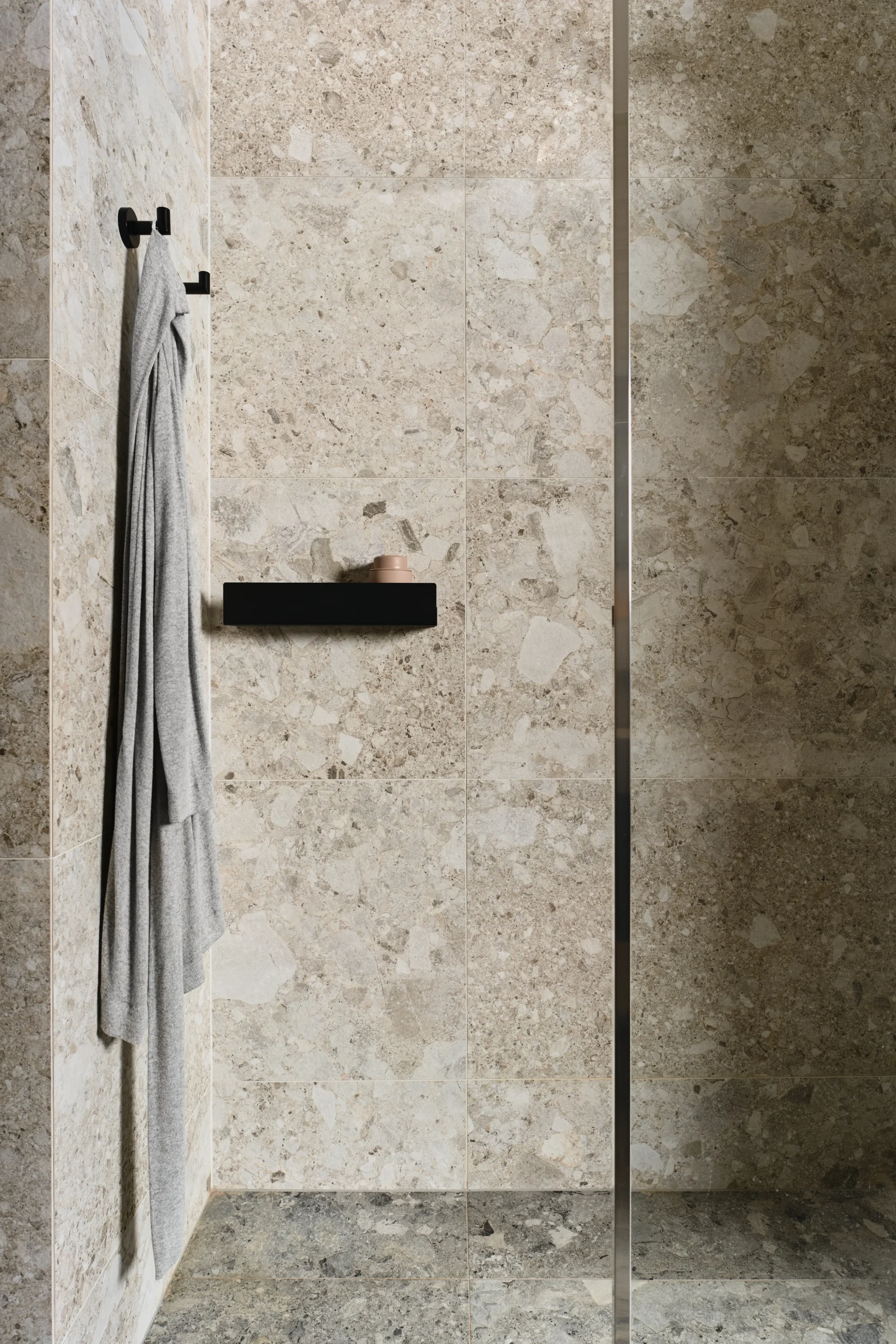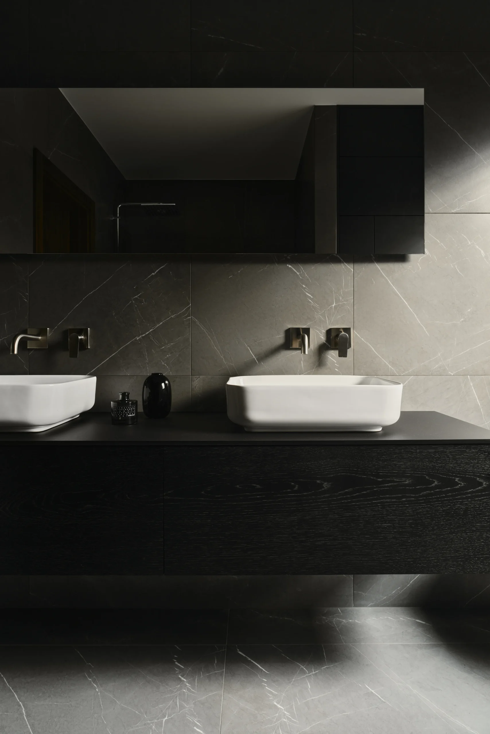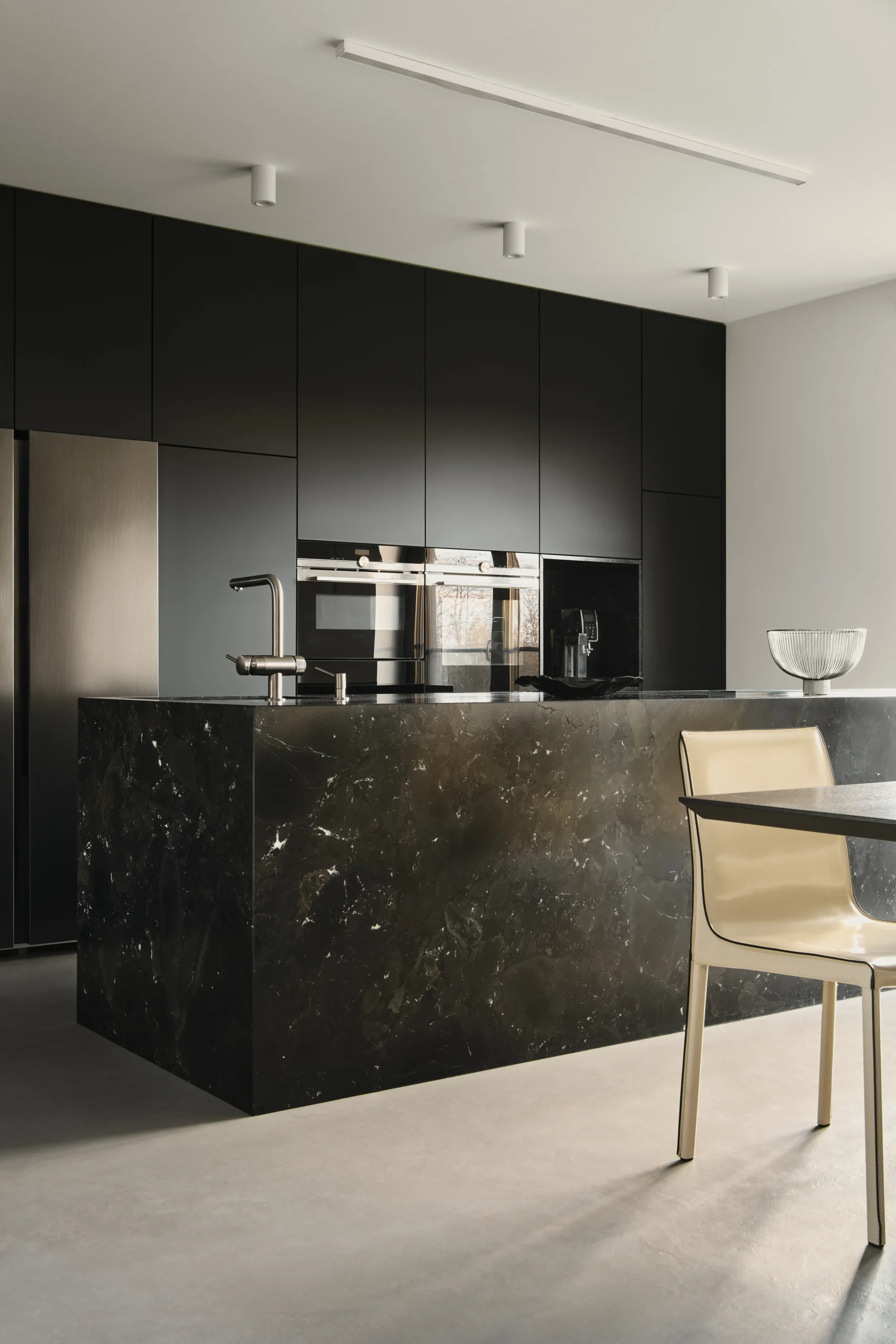 Projekt opiera się na stonowanej palecie kolorów, w której dominują odcienie bieli, szarości i czerni, co wprowadza spokój i równowagę do przestrzeni. Zastosowane materiały, takie jak drewno, kamień czy metal, tworzą subtelną elegancję, jednocześnie zachowując przyjazną atmosferę. Wnętrze zostało zaprojektowane z dbałością o detale, co nadaje mu ponadczasowy charakter.
